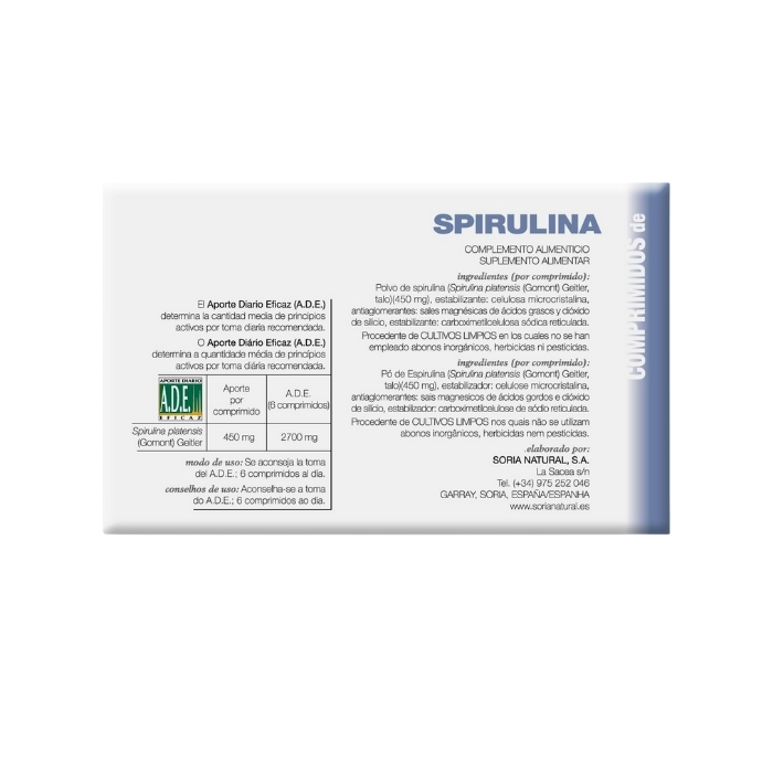 Spirulina da Soria Natural é um suplemento alimentar natural em comprimidos, elaborado a partir da microalga spirulina (Arthrospira platensis), reconhecida mundialmente pelo seu alto valor nutricional. Este produto é uma excelente fonte de proteínas vegetais, vitaminas, minerais e antioxidantes, ideal para quem procura um reforço natural de energia, vitalidade e bem-estar geral.